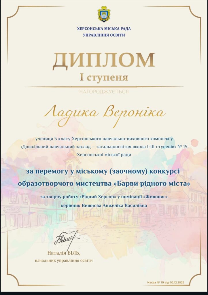 Новини Вітаємо! Зоткіна Ольга Гру 15, 2025 0 Вітаємо нашу ученицю Ладику Вероніку з почесним першим місцем у конкурсі «Барви рідного міста»! Пишаємось твоїм талантом, наполегливістю та творчістю. Бажаємо натхнення, нових ідей і подальших перемог