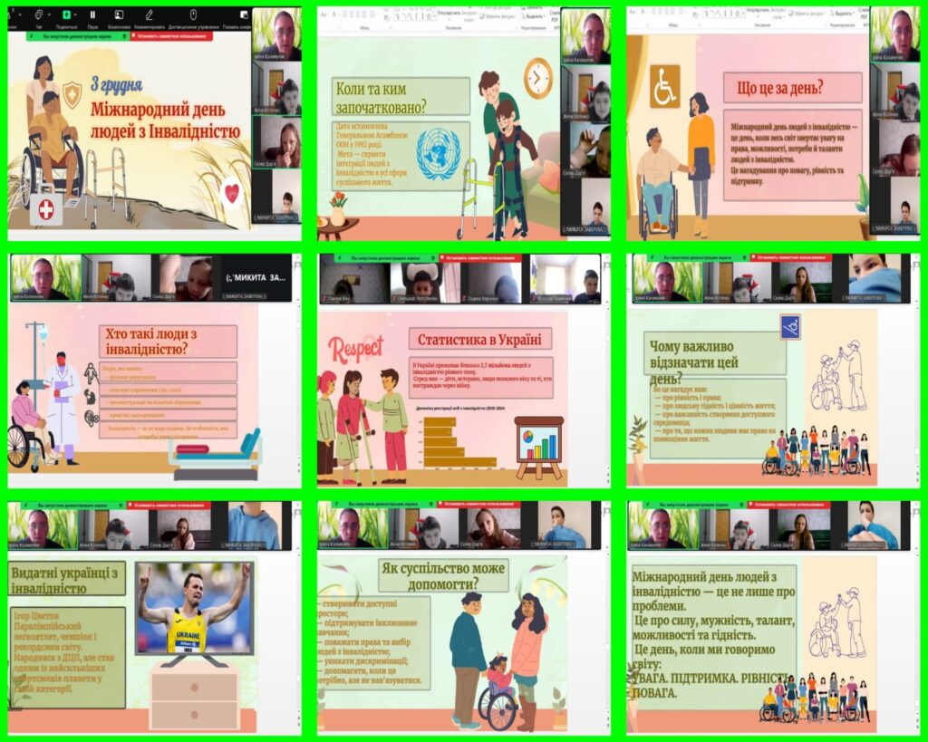 В межах цієї акції 3 грудня з учнями 5 класу була проведена змістовна та чутлива бесіда присвячена Міжнародному дню людей з інвалідністю, мета якої формування в дітей розуміння важливості толерантного ставлення, підтримки та поваги до людей, які мають інвалідність.