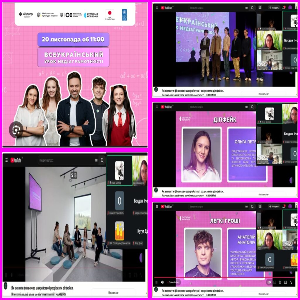20 листопада 2025 року, учні 9-А класу Херсонського НВК № 15 долучились до Всеукраїнського уроку з медіаграмотності. Під час уроку учні поглибили свої знання про фінансову безпеку та онлайн-шахрайство, про діпфейки та штучний інтелект. Адже бути медіаграмотним сьогодні – це вміти приймати зважені рішення та відповідально діяти в інформаційному просторі.