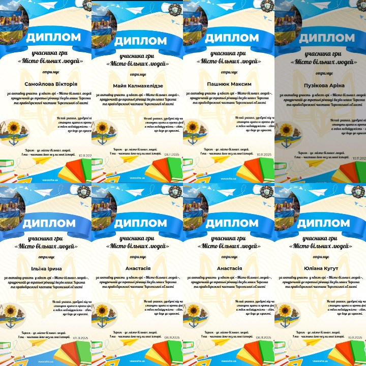 Наші учні взяли активну участь у веб-квесті «Місто вільних людей», присвяченому 3-й річниці визволення Херсона від окупантів. Це була чудова нагода не лише перевірити свої знання з історії, а й відчути гордість за незламність нашого народу та мужність захисників, які повернули Херсону свободу.